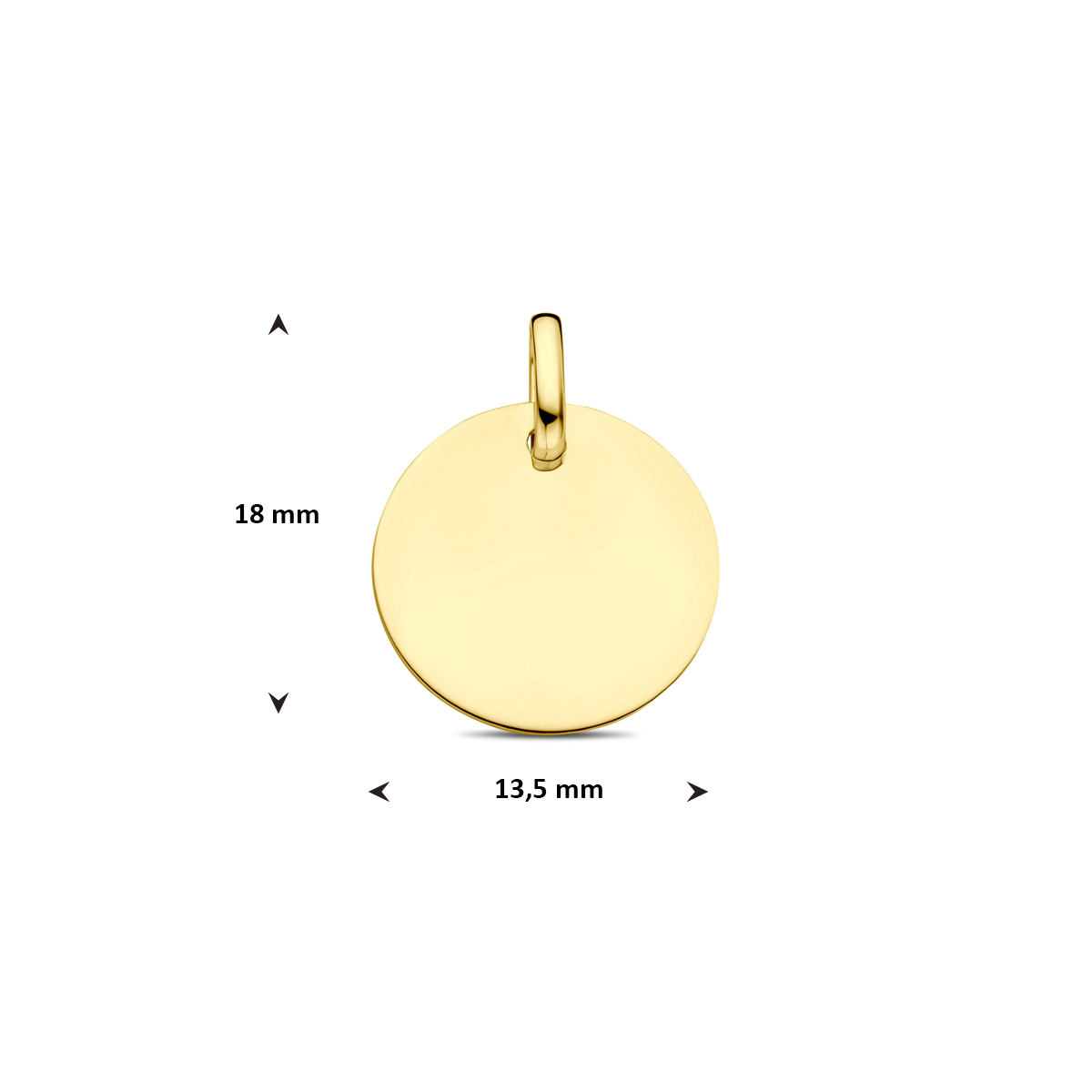 9k Geel kleurig graveerhanger. De graveerhanger heeft een diameter van 13.5 mm. De graveerhanger heeft een totale hoogte van 18 mm.