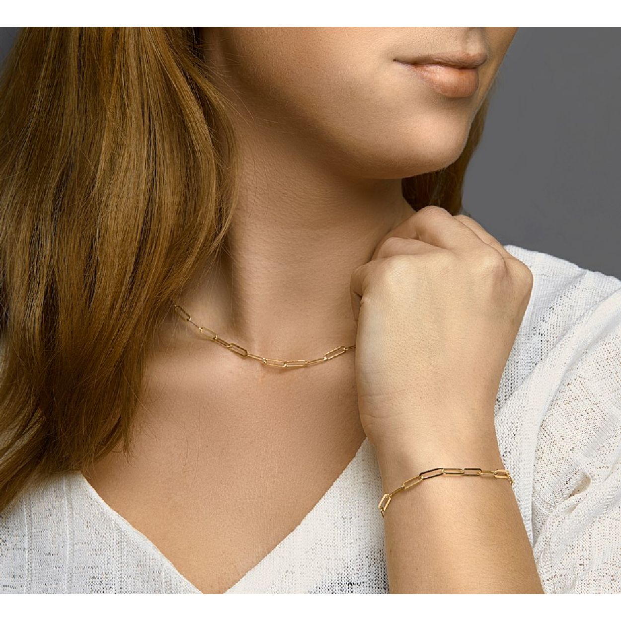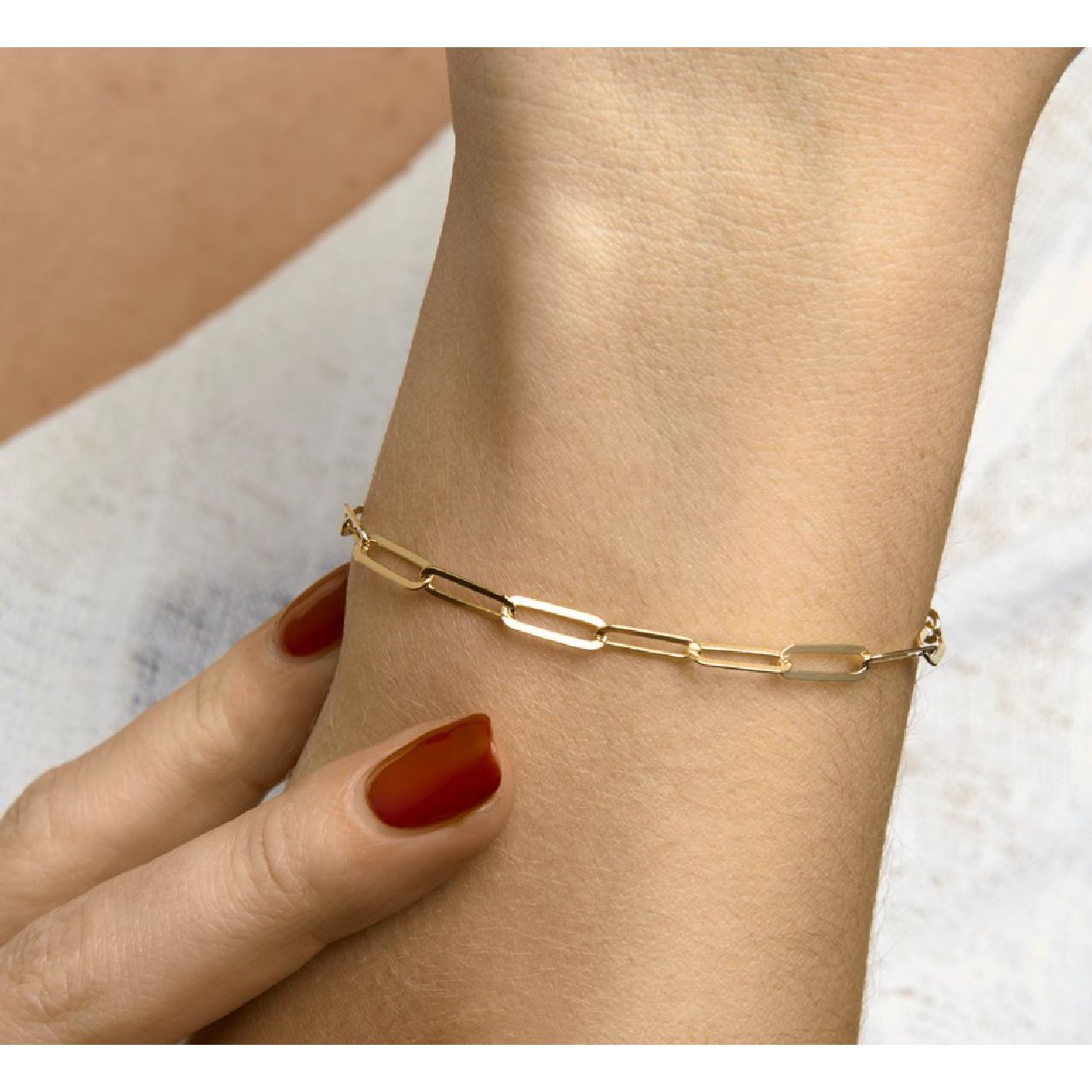 De armband is gemaakt van geelgoud op zilver en is goudkleurig. Het is een sieraad voor dames.