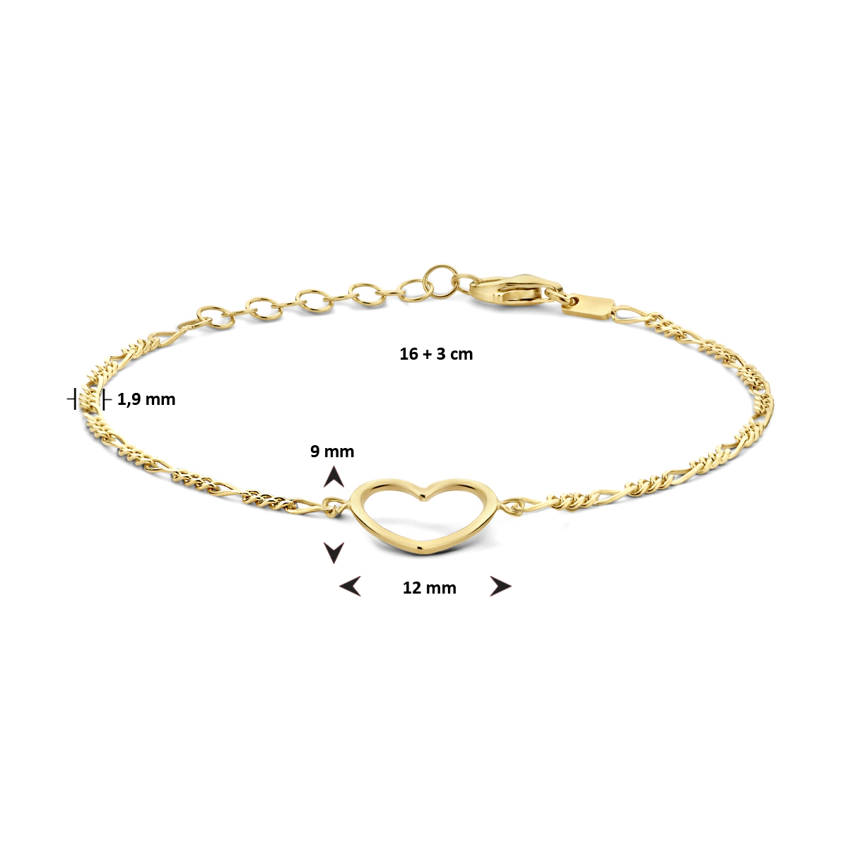 Geelgoud op 925 zilveren figaro armband uitgevoerd met een hartje. De armband heeft een draaglengte van 16cm met een extensie van 3cm en een stevige karabijn sluiting. Geen garantie op plating.