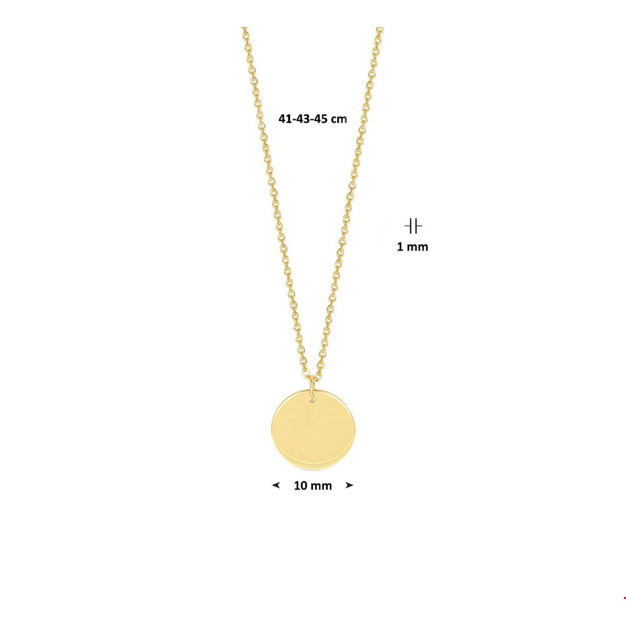 Trendy geelgouden 1mm anker collier met draaglengtes van 41 43 en 45cm. Uitgevoerd met een poli afgewerkt rondje van 10mm en een stevige karabijn sluiting. Door het simplistische design gemakkelijk te combineren met andere gouden rondjes sieraden.