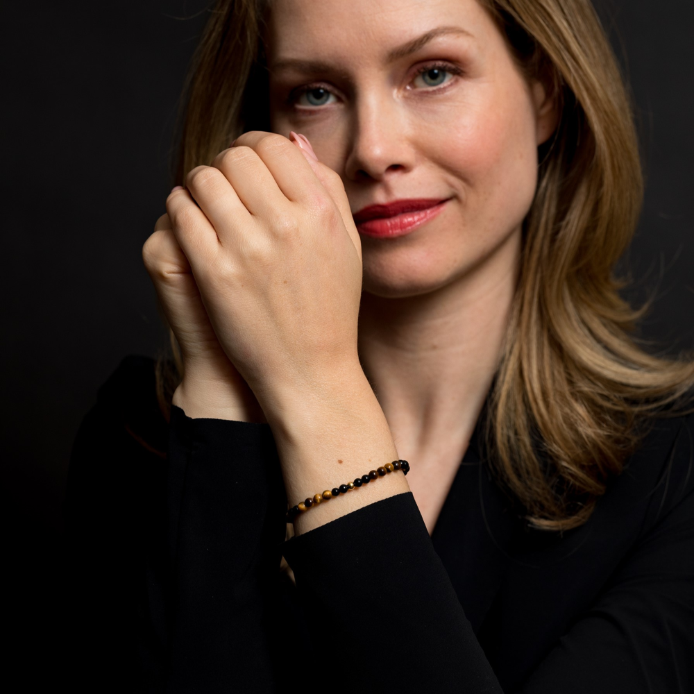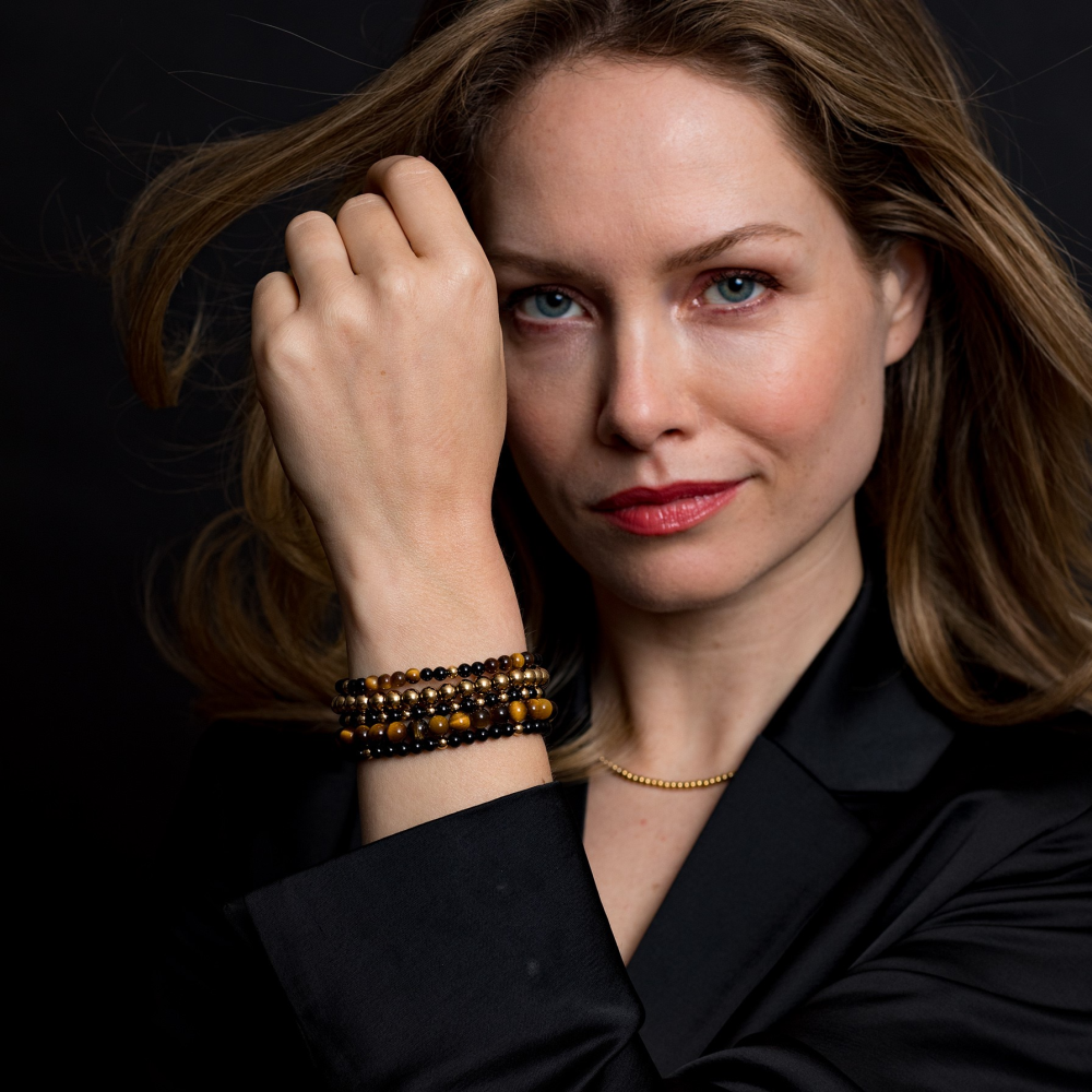 Armband van het merk Rebel & Rose. De armband heeft een hoogwaardige elastische stretch koord, met 4mm van Tijgeroog, Onyx, RVS ion-gold plated.