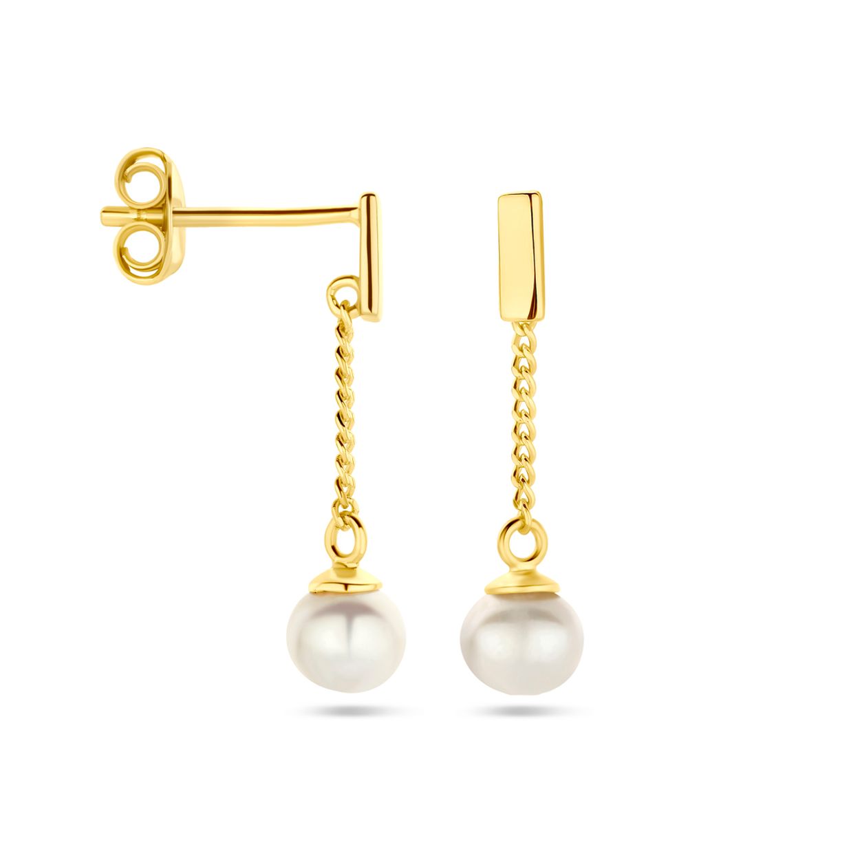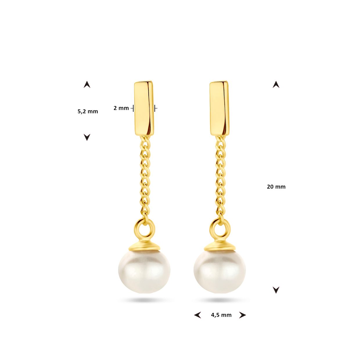Geelgoud op 925 zilveren oorhangers  (1 micron) uitgevoerd met een zoetwaterparel. De oorhangers hebben een totale hoogte van 2cm. Het balkje heeft een afmeting van 5.2x2mm.