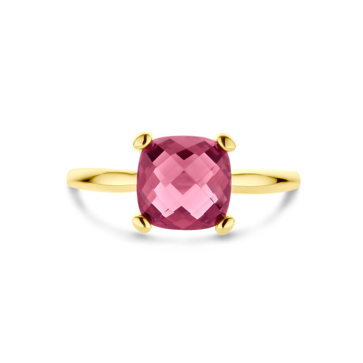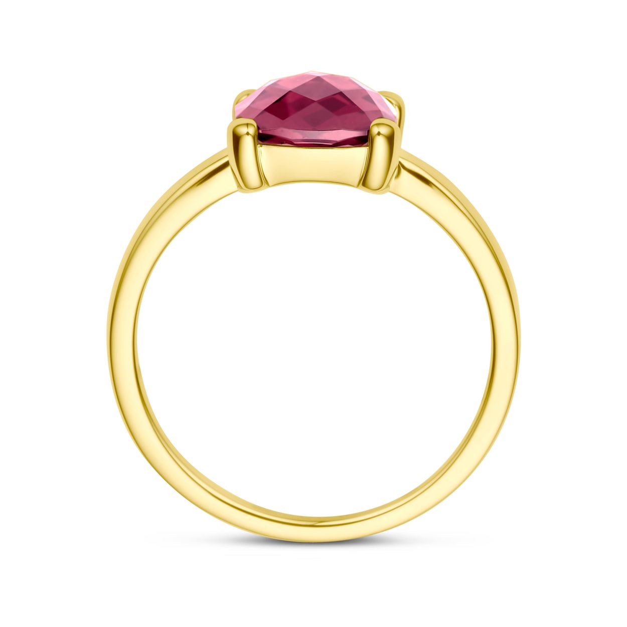 14k Geelgouden ring uitgevoerd met roze rhodoliet. De ring heeft een breedte van 9mm.