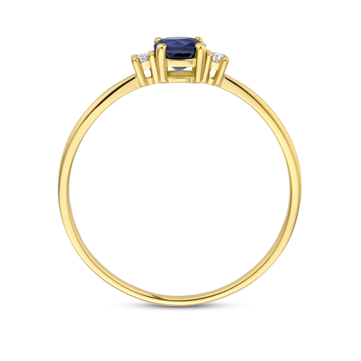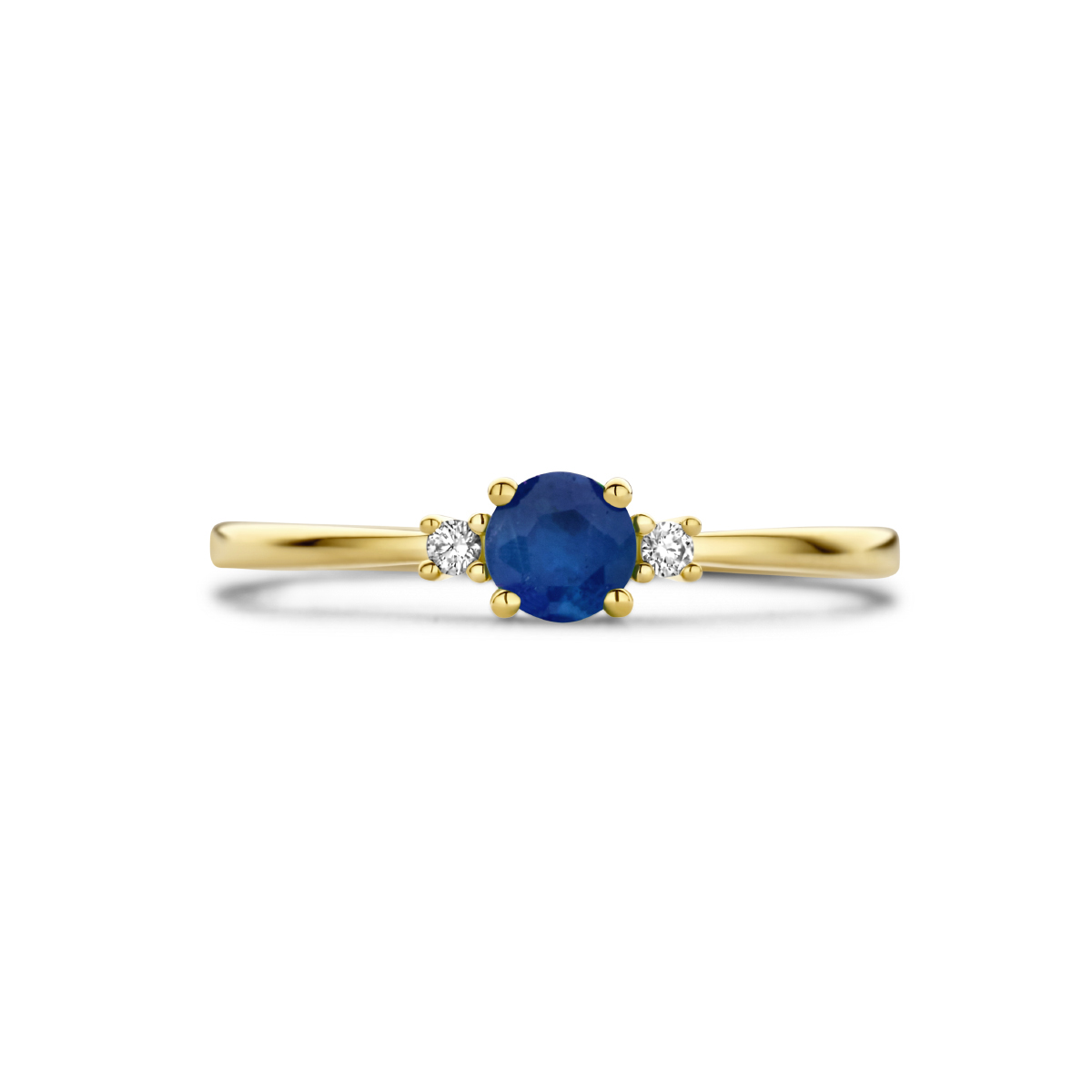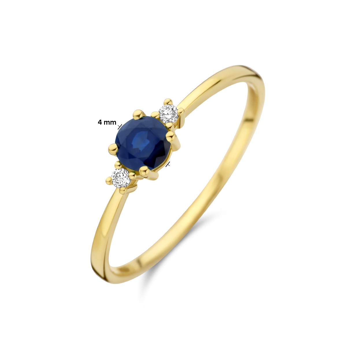 14k Geelgouden ring uitgevoerd met schitterende saffier en diamant. De ring heeft een breedte van 4mm. Het diamantgewicht is 0.03ct (2x 0.015ct).