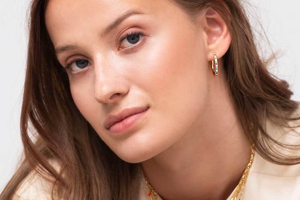 Sif Jakobs oorringen uit de Ellera X-grande collectie - Zilveren oorringen verguld met 18 kt en multicolor zirkonium steentjes - 2,4 cm diameter - 2mm dik