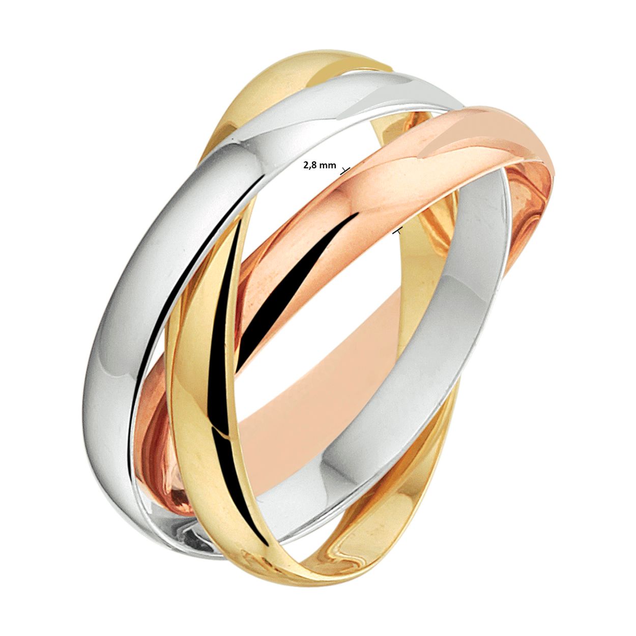 Tricolor wit-, rose- en geelgouden ring bestaande uit 3 in elkaar geplaatste losse ringen. De losse ringen hebben elk een breedte van 2.8mm.