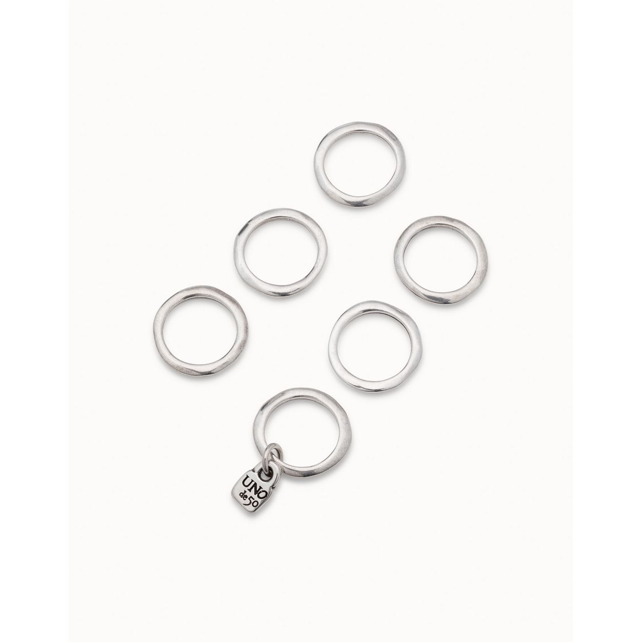 Deze ring is van het merk UNO de 50. Het is een damessieraad gemaakt van metaal. De ring is zilver van kleur. De maat van het sieraad is 18.5.