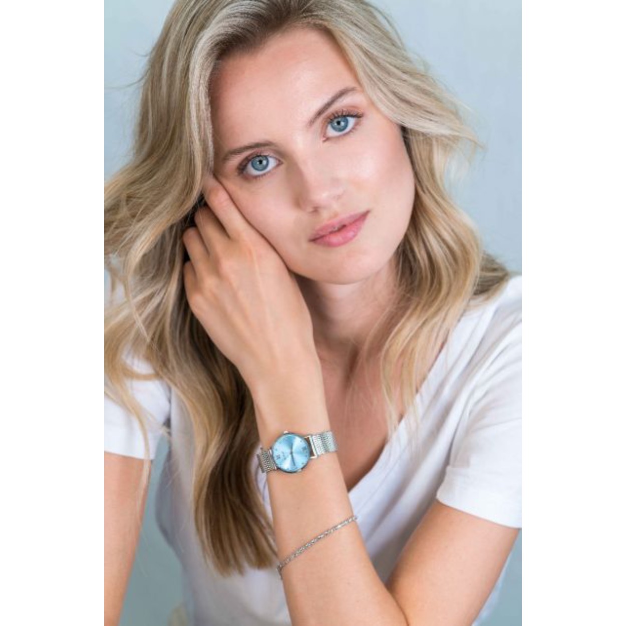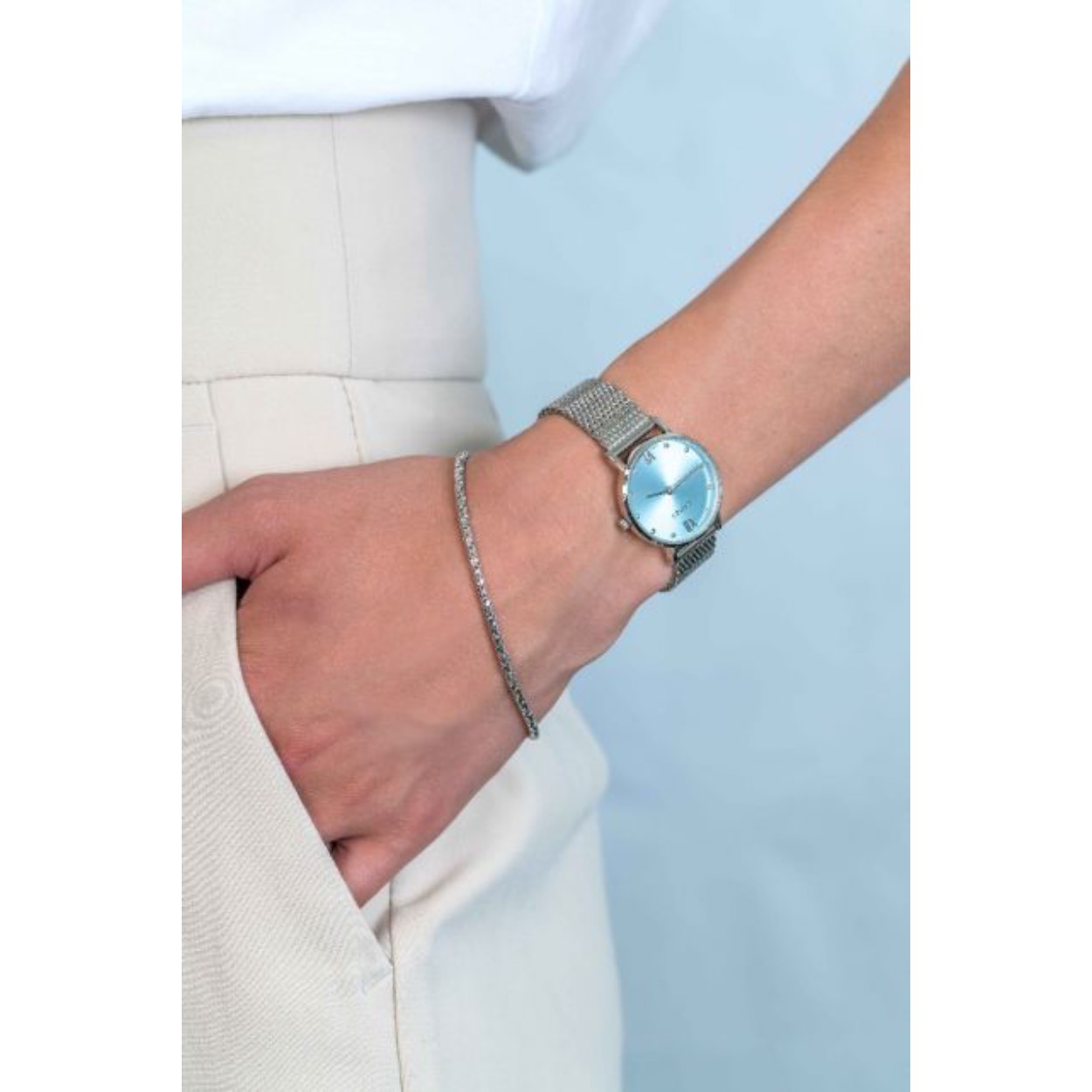 ZINZI Lady Crystal horloge ice blue wijzerplaat en kast stalen mesh band, witte crystals bij uuraanduiding, 28mm extra dun ZIW645M